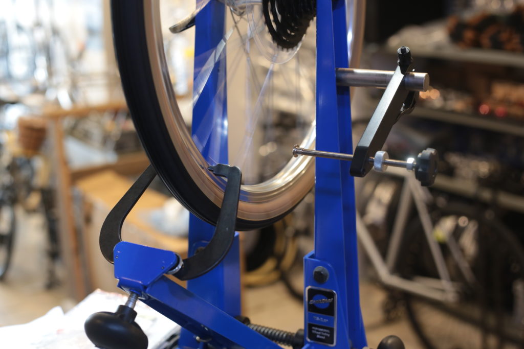 組み付け前にリムの左右のブレを修正しています。